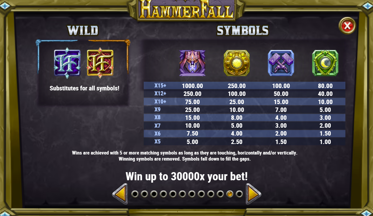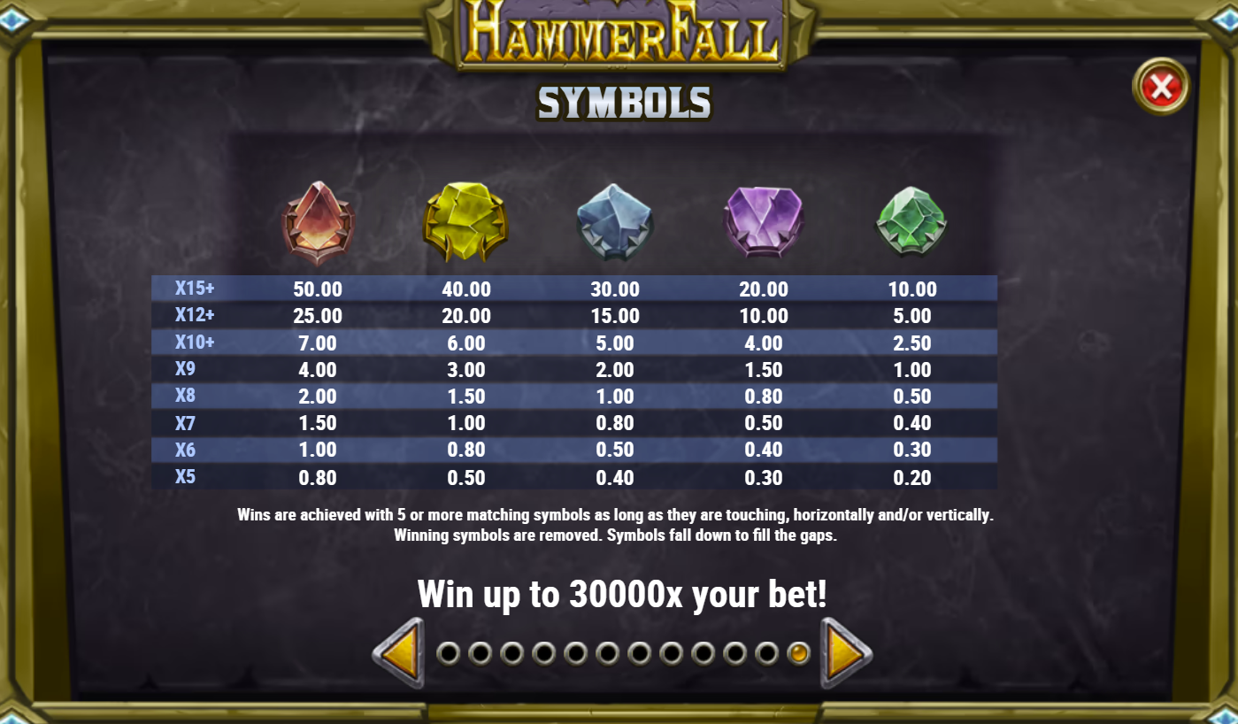 Hammerfall uses a standard 5x3 layout with 20 paylines, but it's supercharged by its unique mechanics. Winning combinations disappear, triggering a tumble where new symbols fall into place, allowing for consecutive wins from a single spin.